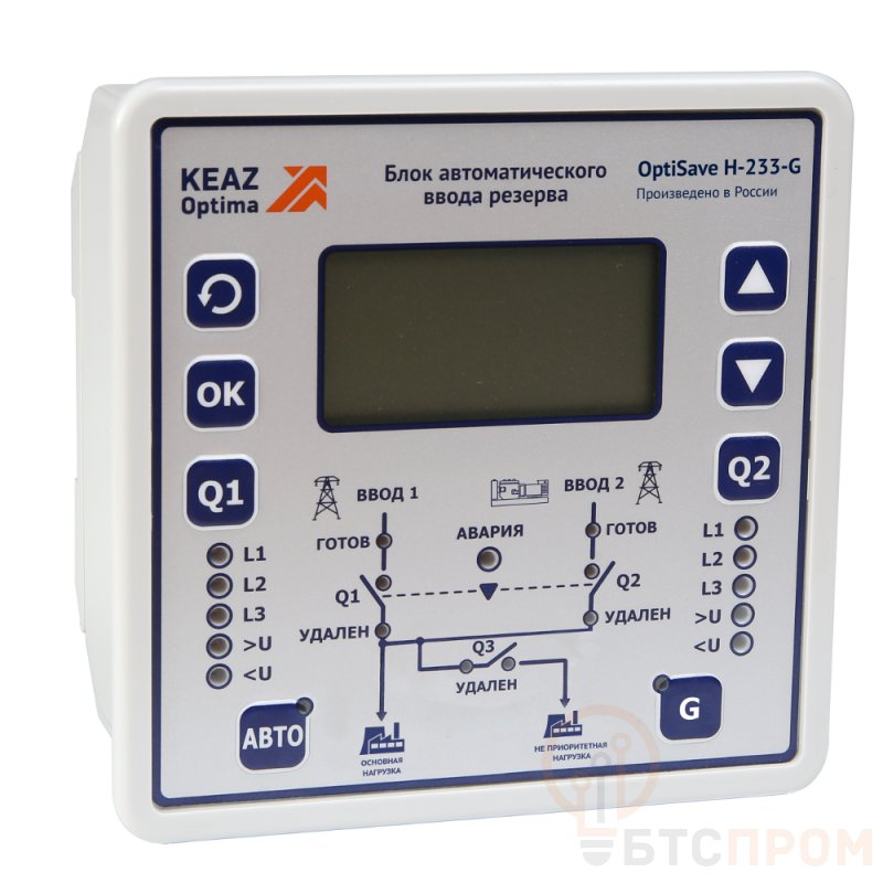 Блок OptiSave Н-233-G применяется в схемах АВР на 2 ввода без секционного выключателя, где в качестве одного из вводов может быть сеть или генератор, а также позволяет управлять 3-мя коммутационными аппаратами и осуществлять интеграцию в систему удаленного контроля и управления по протоколу Modbus RTU.
