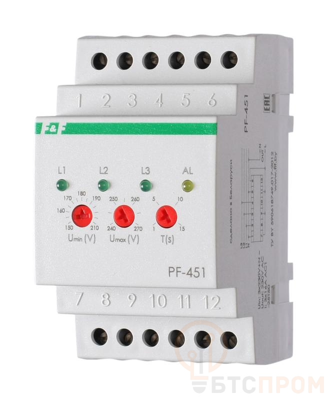 Переключатель фаз PF-451 (с выходами для контакторов; с регулируемыми верхними (230-260) и нижними (150-210) значениями напряжения переключения; монтаж на DIN-рейке 35мм 3х400/230+N 3х16А IP20) F&F EA04.005.003