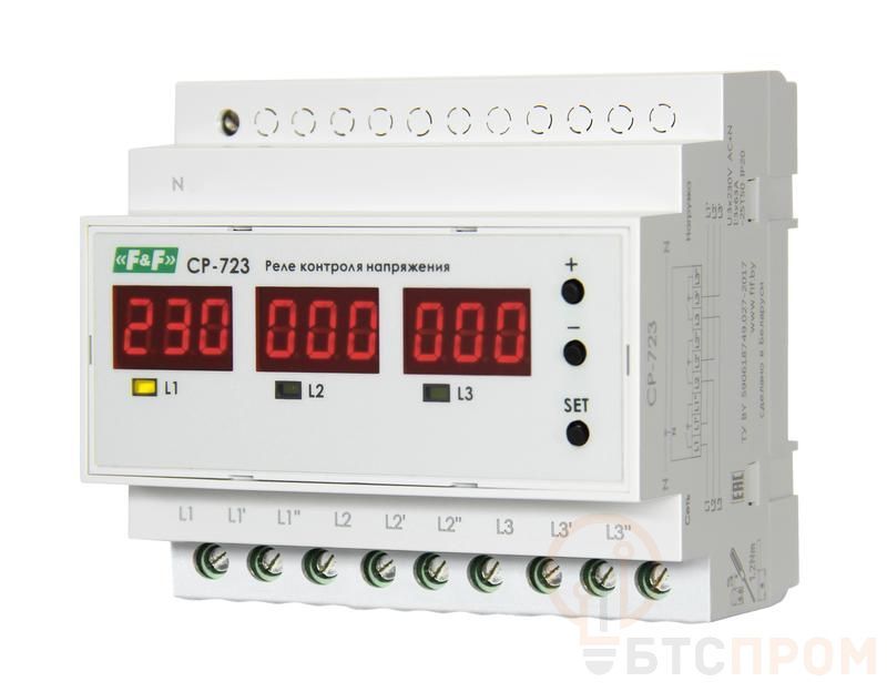 Реле контроля напряжения CP-723 (трехфазное; два режима работы - три однофазных реле или трехфазное реле напряжения; монтаж на DIN-рейке; 100…450 AC 3NO 3х63А) F&F EA04.009.015