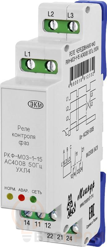 Реле контроля трехфазного линейного напряжения РКФ-М03-1-15 AC400В УХЛ2 от производителя «Меандр» — это специализированное устройство, предназначенное для непрерывного мониторинга параметров трехфазной сети. Оно обеспечивает надежную защиту электрооборудования от несимметрии фаз, обрыва нулевого провода, а также от опасных колебаний напряжения в сетях до 400 В.