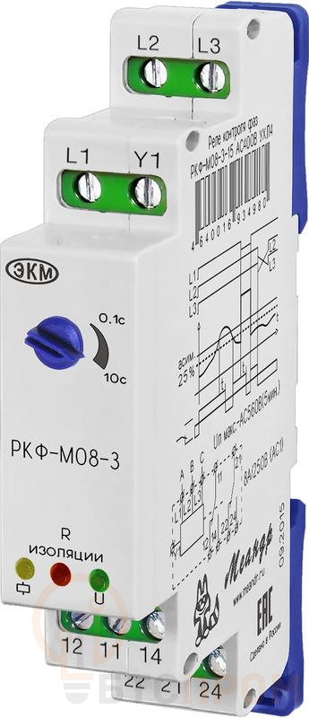 Реле контроля трехфазного линейного напряжения РКФ-М08-3-15 AC400В УХЛ4 аналог ЕЛ-13 с функцией контроля сопротивления изоляции задержка сраб. 0.1-10с ток контактов исполн. реле 8А 2п Меандр A8302-16935000