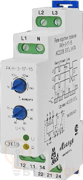 Реле контроля напряжения РКН-3-17-15 AC58В/AC100B УХЛ2 от производителя «Меандр» — это специализированное устройство, предназначенное для автоматического контроля и защиты трехфазных сетей. Оно обеспечивает непрерывный мониторинг параметров сети, включая обрыв фазы, перекос фаз, а также недопустимое повышение или понижение напряжения.