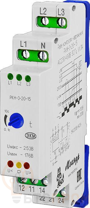 Реле контроля трехфазного напряжения РКН-3-20-15 AC230В/AC400B УХЛ4 4-х проводная схема вкл. задержка срабатывания от 0.1-10с ток контактов исполнительного реле 8А 2п Меандр A8302-16934034