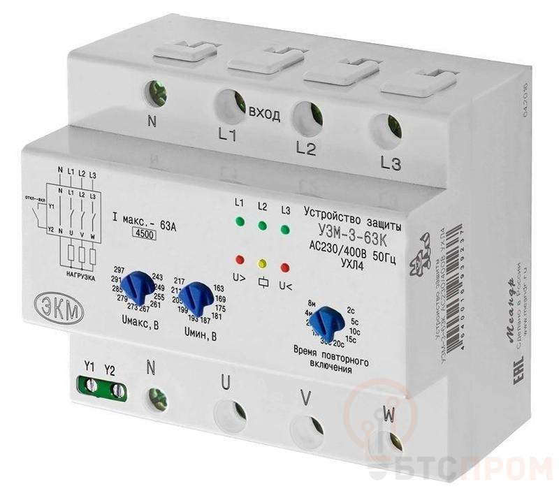 УЗМ-3-63К — это современное многофункциональное реле защиты, предназначенное для обеспечения максимальной безопасности и стабильности работы однофазных электрических сетей 230 В. Устройство эффективно защищает подключенное оборудование от критических изменений параметров сети: скачков и провалов напряжения, перегрузок и коротких замыканий.
