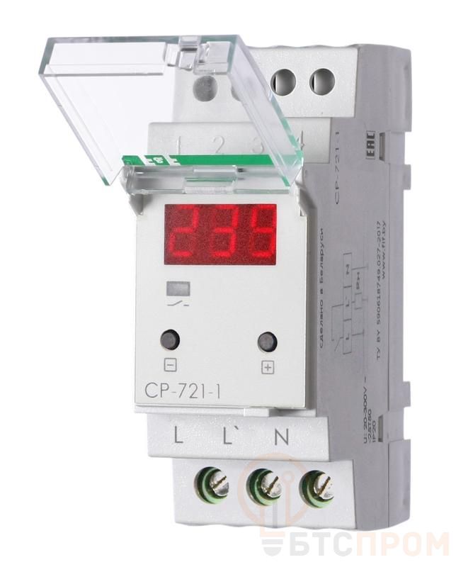 Реле напряжения 1ф CP-721-1 (CP-721-63A) УХЛ2 диап. рабочих температур -40...+55град.C цифровая индикация; 50-450В контакт 1NO 63А встроен. таймер регистрация аварий в памяти индикация текущего напряж. F&F EA04.009.018