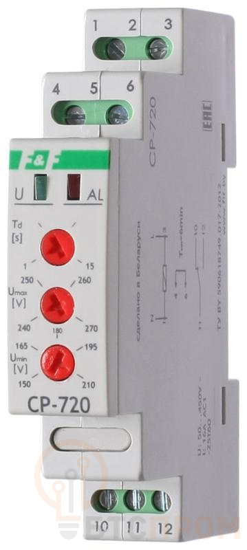 Реле напряжения CP-720 (однофазный; контроль верхнего и нижнего значений напряжения; 150-450В AC 16А 1NO/NC IP20) F&F EA04.009.002