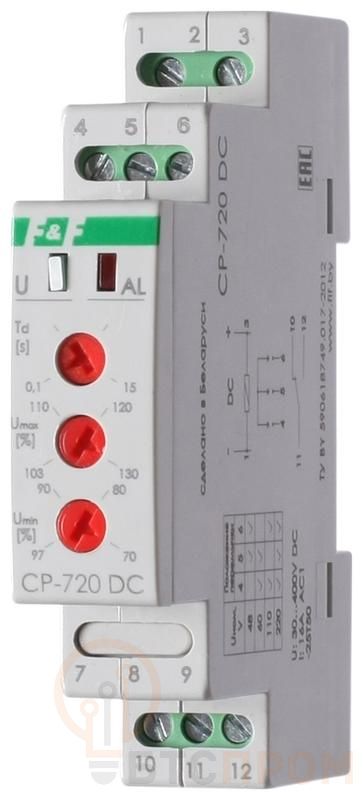 Реле напряжения CP-720DC (однофазное; контроль верхнего и нижнего значений напряжения; выбор напряжения контролир. сети; 1 модуль 30-400В DC 16А 1NO/NC IP20) F&F EA04.009.012