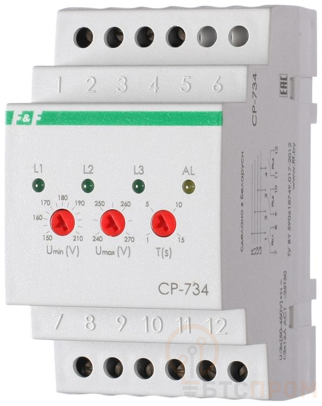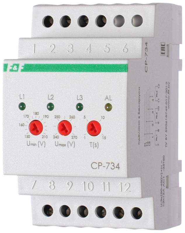 Реле напряжения CP-734 (трехфазное; контроль нижнего (150-210В) и верхнего (240-270В) порога напряжения; отдельный контакт на каждую фазу; монтаж на DIN-рейке 35мм 3х400/230 N 3х8А 3х1R IP20) F&F EA04.009.007