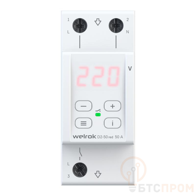 Реле напряжения D2-50 от Welrok — это надежное устройство для защиты однофазной бытовой и промышленной техники от опасных колебаний в сети. Прибор автоматически отключает питание при выходе напряжения за установленные пользователем пределы (например, 170-250 В) и включает его с задержкой после нормализации параметров сети.