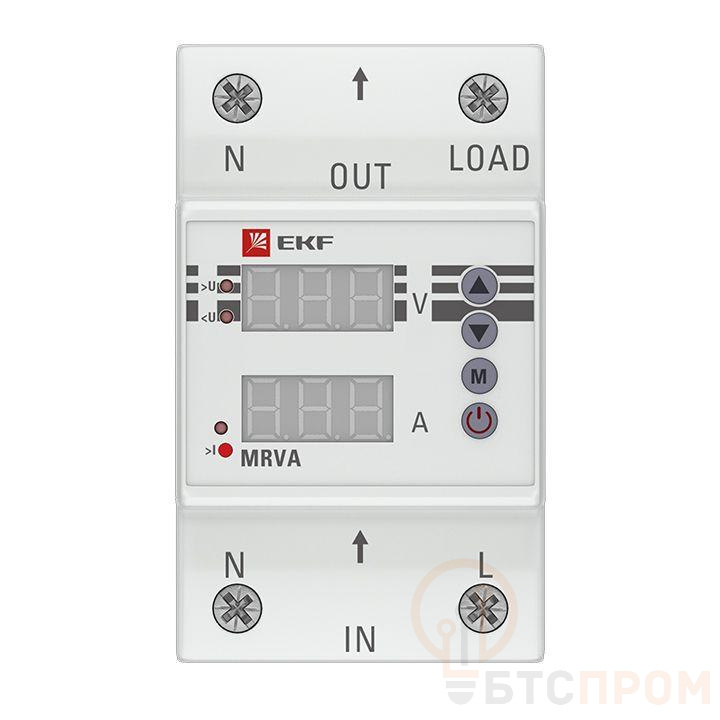 Реле напряжения и тока EKF PROxima являются микропроцессорным устройством и предназначено для постоянного контроля напряжения в однофазных и трехфазных сетях (MRVA-3) переменного тока, для защиты электроустановок от перепадов напряжения. Реле контролирует напряжение в сети в установленном диапазоне и при выходе напряжения за пределы диапазона отключает оборудование от сети электропитания с заданной выдержкой времени. Установка диапазона напряжения и времени срабатывания производится с помощью поворотных регуляторов (RV-5A, RV-32F) либо при помощи кнопок (MRV, MRVA, MRVs) расположенных на лицевой поверхности реле.