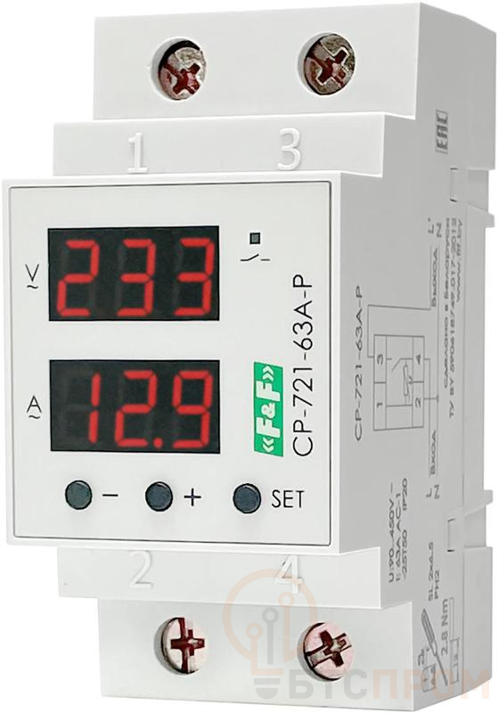 Реле напряжения с контролем тока и мощности CP-721-63A-P 1ф контакт 1NO 63А 90..450В TrueRMS. F&F EA04.009.027