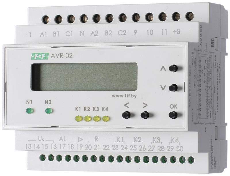 Устройство управления резервным питанием серии AVR. Монтаж на DIN-рейку. Предназначено для построения блоков АВР с двумя или тремя вводами питания (генераторной установкой), с секционными выключателями, с одной или двумя нагрузками. Принцип работы. Устройство управления AVR-02 контролирует напряжение на основном вводе трехфазной сети переменного тока. Если напряжение в пределах нормы, нагрузка подключается к вводу с помощью внешнего силового аппарата (контактора, автоматического выключателя с моторным приводом и т.п.), которым управляет исполнительное реле AVR-02. При аварии основного ввода нагрузка переключается на резервный. При восстановлении питания на основном вводе нагрузка переключается на него. Изделие имеет входы контроля положения и входы контроля - аварийных контактов силового аппарата. По ним определяется его состояние, не допускается “встречное” включение вводов и подключение исправного ввода на аварийную линию питания нагрузки. Допустимые пределы напряжения и временные параметры переключения устанавливаются с лицевой панели AVR-02. Питание осуществляется от контролируемых вводов. Особенности: для работы в составе блоков: АВР 2.0; АВР 2.1; АВР 2.2; АВР 3.0; АВР 3.1; контроль наличия фаз; контроль минимального и максимального напряжения в фазах; контроль чередования, слипания фаз; контроль асимметрии фаз; управление контакторами и моторными приводами; контроль состояния контакторов (моторных приводов); контроль срабатывания выключателей по сверхтоку; формирование напряжения оперативного питания; формирование сигнала запуска генератора; формирование сигнала “Авария”; ограничение доступа к настройкам вводом PIN-кода; пуско-наладочный режим; возможность работы от внешнего источника питания; сохранение работоспособности в диапазоне напряжений от 24 до 450В; использования в однофазных цепях.