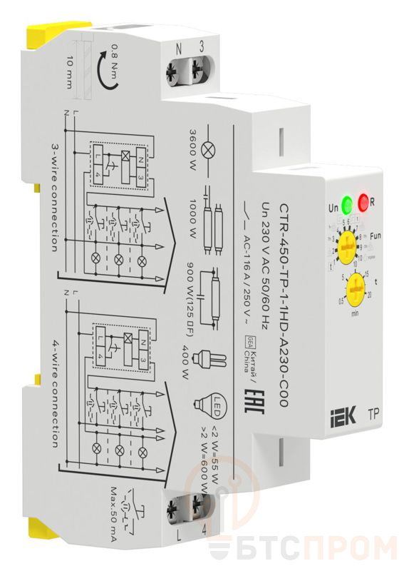 Ключевая особенность — функция задержки выключения (TP, Time Push), позволяющая установить временной интервал перед отключением нагрузки после получения команды. Управление осуществляется кратковременными импульсами от кнопочных выключателей, что значительно экономит кабельную продукцию при монтаже.