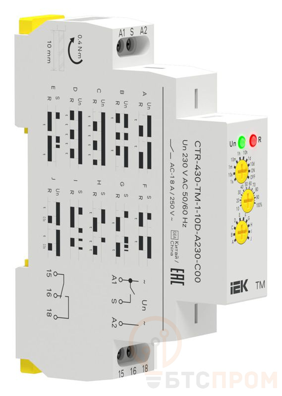 Реле времени многофункциональное TM IEK серии CTR-430 — это современное электронное устройство, предназначенное для автоматизации управления различными нагрузками по заранее заданному временному циклу. Модель TM-1-10D-A230-C00 оснащена одним контактом (1з) с номинальным напряжением управления 230 В переменного тока.