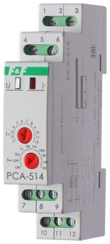 Реле времени серии "PCA" Монтаж на DIN-рейку. Предназначено для выключения потребителей в системах автоматики (в вентиляционных, отопительных, осветительных, сигнализационных и т.п.) по истечении заданного отрезка времени. Принцип работы При включении питания включается реле, замыкаются контакты 8-9, 11-12. После отсчёта установленной выдержки времени контакты реле возвращаются в положение 8-7, 11-10 и в таком положении остаются до отключения питания. Для повтора цикла работы необходимо отключение напряжения питания и подача его повторно. Особенности: напряжение питания 230 В AC; 24 В AC/DC; диапазон выдержки времени 0,1 с...24 суток ; контакт - 2NO/NC (2х8 А).