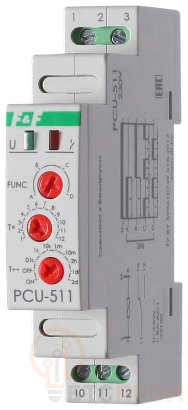 Реле времени серии "PCU" Монтаж на DIN-рейку. Предназначено для включения/выключения потребителей в системах автоматики (в вентиляционных, отопительных, осветительных, сигнализационных и т.п.) на заданный отрезок времени. Функции: Включение нагрузки на время t (A); Задержка включения(В); Циклическая работа с задержкой выключения (С); Циклическая работа с задержкой включения (D). Особенности: многофункциональное (4 функции); напряжение питания 230 В AC; диапазон выдержки времени 0,1 с...24 суток ; контакт - 1NO/NC (8 А).