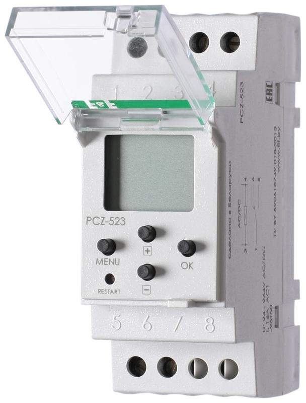 Реле времени серии "PCZ" Монтаж на DIN-рейку . Для включения и выключения станков, механизмов, конвейеров, вентиляции, подачи звонков по расписанию в учебных учреждениях и т. п. Принцип работы Включение приборов и оборудования в запрограммированное время (часы, минуты), выключение – по окончании установленного времени (длительности импульса) в диапазоне от 1 секунды до 99 минут 59 секунд. Возможно задание 2 программ работы, например, подача звонков по расписанию в школе в обычные или предпраздничные дни (переключение осуществляется вручную). Особенности: ЖК дисплей; 60 ячеек памяти; 2 группы программ; автоматический и ручной режим работы; индикация текущего времени дня недели и режима работы; автоматическая смена времени зима/лето; напряжение питания 24...264 В AC; дискретность установки времени 1 с ; контакт - 1NO/NC (16 А).