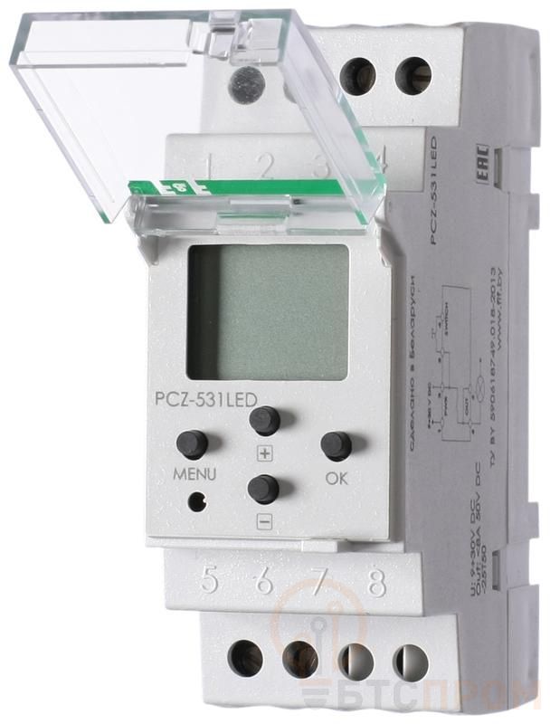 Реле времени PCZ-531LED 8А 9-30В DC IP20 2мод. 1 канал программирован. изменения уровня яркости ламп накаливания или LED лент с 9-30В DC недельный цикл установка на DIN-рейку F&F EA02.002.016