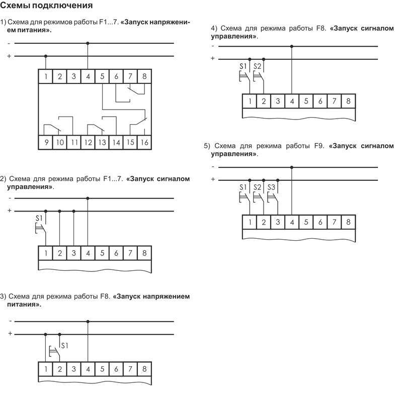 Реле времени серии "RV" Монтаж на DIN-рейку. Предназначенодля коммутации электрических цепей (до 3-х независимых цепей К1, К2, К3) с предварительно установленными выдержками времени t1, t2 и t3 для применения в схемах автоматики. Режимы работы Режим F1.1...F1.3 - «Формирование импульса по К1. Задержка включения нагрузки по К2 и К3»; Режим F2.1...F2.3 - «Формирование импульса по К1. Задержка выключения нагрузки по К2 и К3»; Режим F3.1...F3.3 - «Формирование импульса по К1. Задержка включения по К2. Задержка выключения по К3»; РежимF4.1...F4.3 - «Задержка включения по К1...К3»; Режим F5.1...F5.3 - «Задержка выключения по К1...К3»; Режим F6.1...F6.3 - «Групповая циклическая работа по К1...К3»; Режим F7.1...F7.3 - «Циклическое последовательное включение трёх нагрузок»; Режим F8.1...F8.3 - «Циклическое последовательное включение двух нагрузок по К2, К3»; Режим F9.1...F9.3 - «Трёхканальное реле с независимым исполнением программ по каждому каналу» Особенности: трехканальное; цифровая индикация; 9 режимов работы; по три ячейки памяти для каждого режима; контакт мгновенного действия; напряжение питания 24 В AC/DC; диапазон выдержки времени 0 с... 99 ч 59 мин ; контакт - 4NO/NC (4х8 А).
