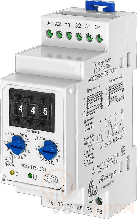 Реле времени РВО-П3-081 ACDC36-240В УХЛ4 14 диаграмм работы три декадных переключателя ток контактов исполнительного реле 8А 2п+1п мгновенный Меандр A8302-16936298