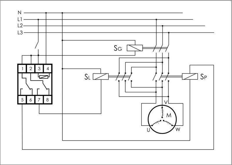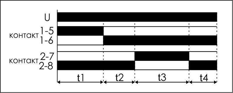Реле времени серии "STP" Монтаж на DIN-рейку. Предназначено для управления электродвигателями в составе оборудования, где требуется циклическое изменение направления вращения электродвигателя с перерывами в работе. Принцип работы При включении питания замыкаются контакты 1-5, включается контактор SR на время t1 – электродвигатель вращается вправо. По истечении времени t1 контакты 1-5 размыкаются и двигатель останавливается на время t2. По его истечении замыкаются контакты 2-7, включается контактор SL и двигатель вращается влево в течение времени t3. По его истечении размыкаются контакты 2-7 и двигатель останавливается на время t4. Затем включение на время t1 и так далее до окончания отсчёта заданного количества циклов работы (программируемый параметр) или отключения питания. Особенности: четырёхвременное циклическое; напряжение питания 24...264 В AC/DC; диапазон установки времени 1 с...99 ч 59 мин 59 с; количество повторяемых циклов 1-999999; контакт - 2NO/NC (2х16 А).