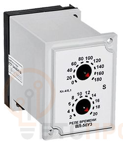 Реле времени ВЛ-50 предназначено для коммутации (замыкания/размыкания) электрических цепей через заданный интервал времени. Реле предусматривает ступенчатое регулирование выдержки, настройка которой производится при помощи переключателей установок на передней панели. Реле времени ВЛ-50 предназначены для создания выдержек времени в цепях управления пуском дизеля тепловозов и путевых машин. Реле обеспечивает выдержку времени от 2 до 200 секунд со 100 ступенями регулирования. Регулировка выдержки времени осуществляется при помощи двух переключателей уставок. Отсчет времени начинается при подаче питающего напряжения. К отличительной особенности ВЛ-50 относят обеспечение стабильной выдержки времени при колебаниях напряжения питания. Реле выпускаются в пластиковом корпусе, который обеспечивает выступающий и утопленный монтаж с подключением внешних проводов при помощи штепсельного разъёма. - обеспечение стабильной выдержки времени при колебаниях напряжения питания; - стабильная работа в тяжёлых условиях эксплуатации.