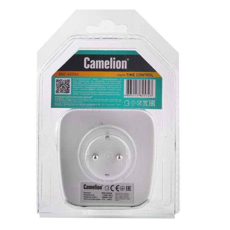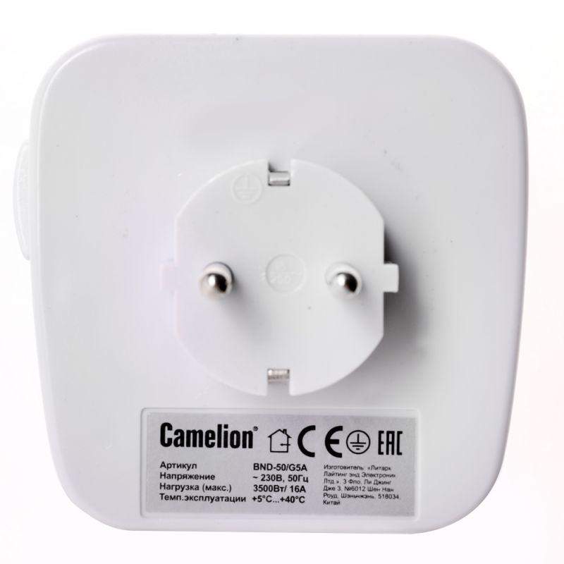 Электромеханический таймер с программированием на сутки предназначен для управления электробытовыми приборами, светом, различными медицинскими приборами, управления приборами для поддержания жизнедеятельности аквариумов и террариумов, создания эффекта присутствия хозяев в доме, управления электроприборами, работающими по ночам. Camelion BND-50/G5A (Таймер механический розеточный, 24-часовая программа, 230/3500Вт), размер 180х130х80мм, мощность 3500Вт. Точность хода: +/- 1 минута в сутки