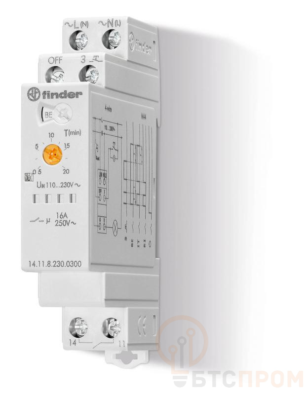 Таймер модульный электронный лестничный мультифункциональный 1NO 16А (контакт без потенциала) 3- или 4-проводная схема 230В AC 17.5мм IP20 FINDER 141182300300