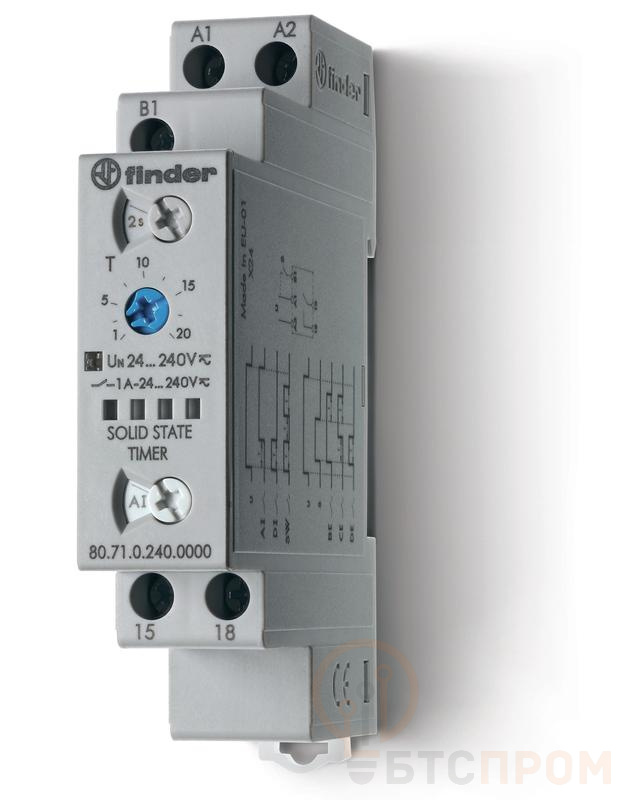 Таймер модульный мультифункциональный (AI DI SW BE CE DE) 24…240В AC/DC выход - твердотельное реле 1NO 1А 17.5мм регулировка времени 0.1с…24ч IP20 FINDER 807102400000
