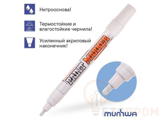 Маркер перманентный на основе жидкой краски MUNHWA Industrial белый (IPM-05) предназначен для использования на всех типах производственных поверхностях: металл, дерево, резина, бетон, стекло, кожа и др. Сферы применения маркер-краски Industrial: металлообработка, деревообработка, строительство, сварочные цеха, автомобилестроение, судостроение, ремонтные работы и многие другие. Краска ложится ярким, плотным, лаковым слоем и закрашивает поверхность с первого раза. Водостойкие и термостойкие чернила (Термообработка: белый цвет - до +1 000°С, остальные цвета - до +500°С), устойчивость к механическим воздействиям.