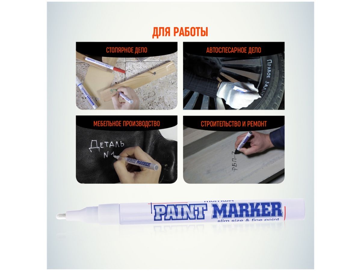 Маркер перманентный на основе жидкой краски MUNHWA Slim белый (SPM-05) предназначен для использования на всех типах производственных поверхностях: металл, дерево, резина, бетон, стекло, кожа и др. Благодаря высококачественным чернилам, краска ложиться на поверхность равномерным и однородным слоем, полностью закрашивая обрабатываемую поверхность, быстро сохнет. Подходит для нанесения надписей на ржавые, промасленные и загрязненные поверхности. После высыхания, надписи обладают свето и водостойкостью, термостойкостью (белый цвет - до +1 000°С, остальные цвета - до +500°С), устойчивостью к механическим воздействиям. Подходит для нанесения надписей на разогретые до +130°С поверхности. Клапанный механизм пишущего узла исключает растекание и разбрызгивание краски, преждевременное пересыхание маркера.