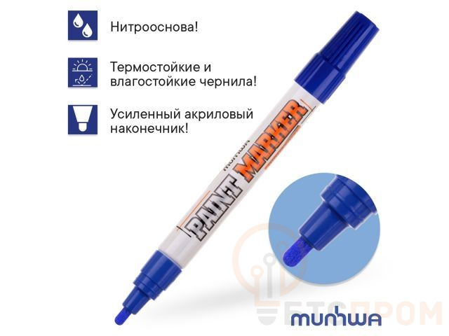 Маркер перманентный на основе жидкой краски MUNHWA Industrial синий (IPM-02) предназначен для использования на всех типах производственных поверхностях: металл, дерево, резина, бетон, стекло, кожа и др. Сферы применения маркер-краски Industrial: металлообработка, деревообработка, строительство, сварочные цеха, автомобилестроение, судостроение, ремонтные работы и многие другие. Высокая укрывистость: краска ложится ярким, плотным, лаковым слоем и закрашивает поверхность с первого раза. Водостойкие и термостойкие чернила (Термообработка: белый цвет - до +1 000°С, остальные цвета - до +500°С), устойчивость к механическим воздействиям. Подходит для нанесения надписей на разогретые до +130°С поверхности. Клапанный механизм пишущего узла исключает растекание и разбрызгивание краски, преждевременное пересыхание маркера, срок годности 5 лет. Усиленный наконечник из акрила обладает высокой прочность и износостойкостью. Устойчив к воздействию высоких температур. Колпачок в цвет краски для быстрой идентификации маркера.