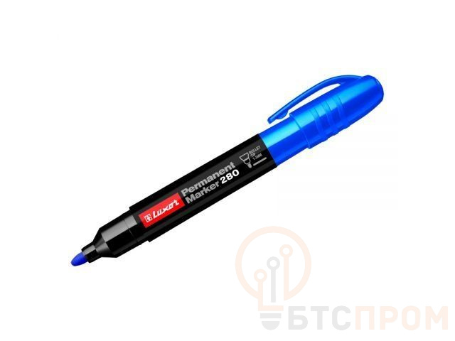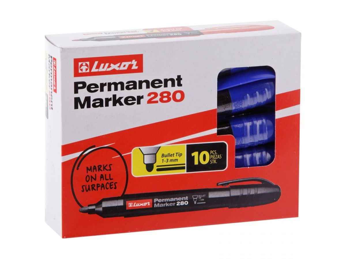 Маркер перманентный LUXOR 280 синий (LUXOR3542) с увеличенной зоной захвата предназначен для использования на всех типах поверхностей: доска, пластмасса, стекло, керамика, металл. Увеличенный запас чернил, пишет в два раза дольше стандартных перманентных маркеров. Чернила на спиртовой основе без ксилола и толуола обладают устойчивостью к различным неблагоприятным внешним факторам, таким как влага, солнечный свет, перепад температуры, поэтому чернила быстро высыхают и не стираются. Увеличенный диаметр корпуса. Круглая форма наконечника. Ширина линии письма 1-3 мм. Цвет чернил - черный. Длина линии письма - 900 метров.