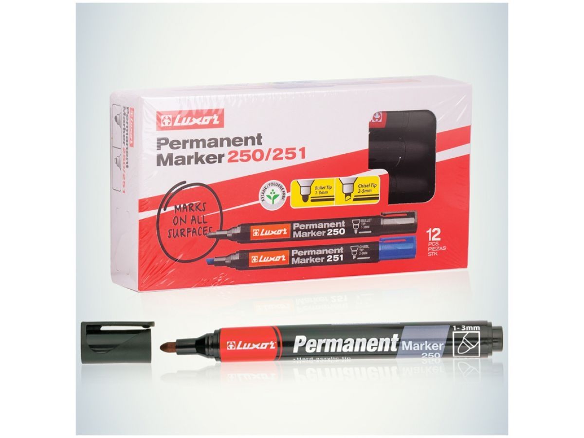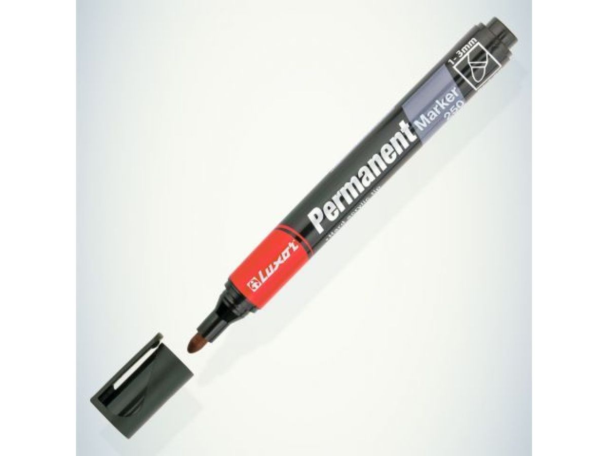 Маркер перманентный фетровый LUXOR 250 черный (LUXOR3451) предназначен для использования на всех типах поверхностей: доска, пластмасса, стекло, керамика, металл. Чернила на спиртовой основе без ксилола и толуола обладают устойчивостью к различным неблагоприятным внешним факторам, таким как влага, солнечный свет, перепад температуры, поэтому чернила быстро высыхают и не стираются. Пулевидная форма наконечника позволяет варьировать толщину линии письма от 1 до 3 мм.