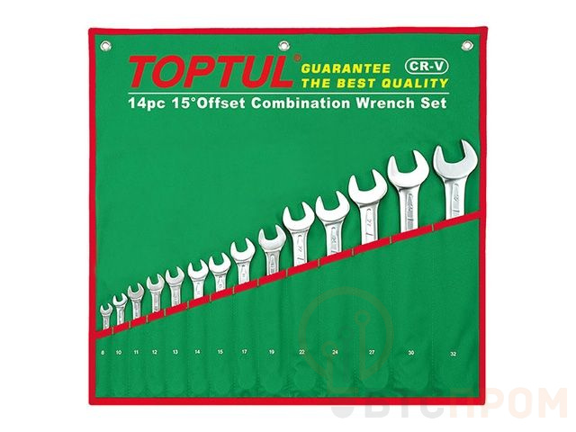 Набор ключей комбинированных TOPTUL состоит из 16 предметов размером 7, 8, 9, 10, 11, 12, 13, 14, 15, 17, 19, 22, 24, 27, 30 и 32 мм серии AAEB0707-3232, имеющих окончание в виде рожкового ключа с одной стороны и окончание в виде накидного ключа с другой стороны.
