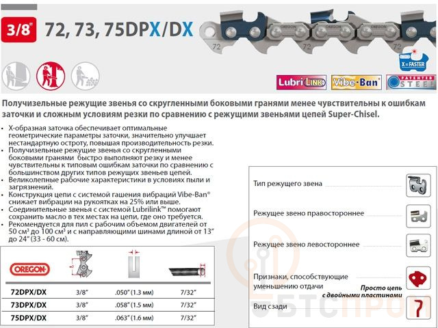 Цепь 40 см 16" 3/8" 1.6 мм 60 зв. 75DPX (в блистере) OREGON (затачиваются напильником 5.5 мм, для проф. интенсивного использования) Q75DP060E