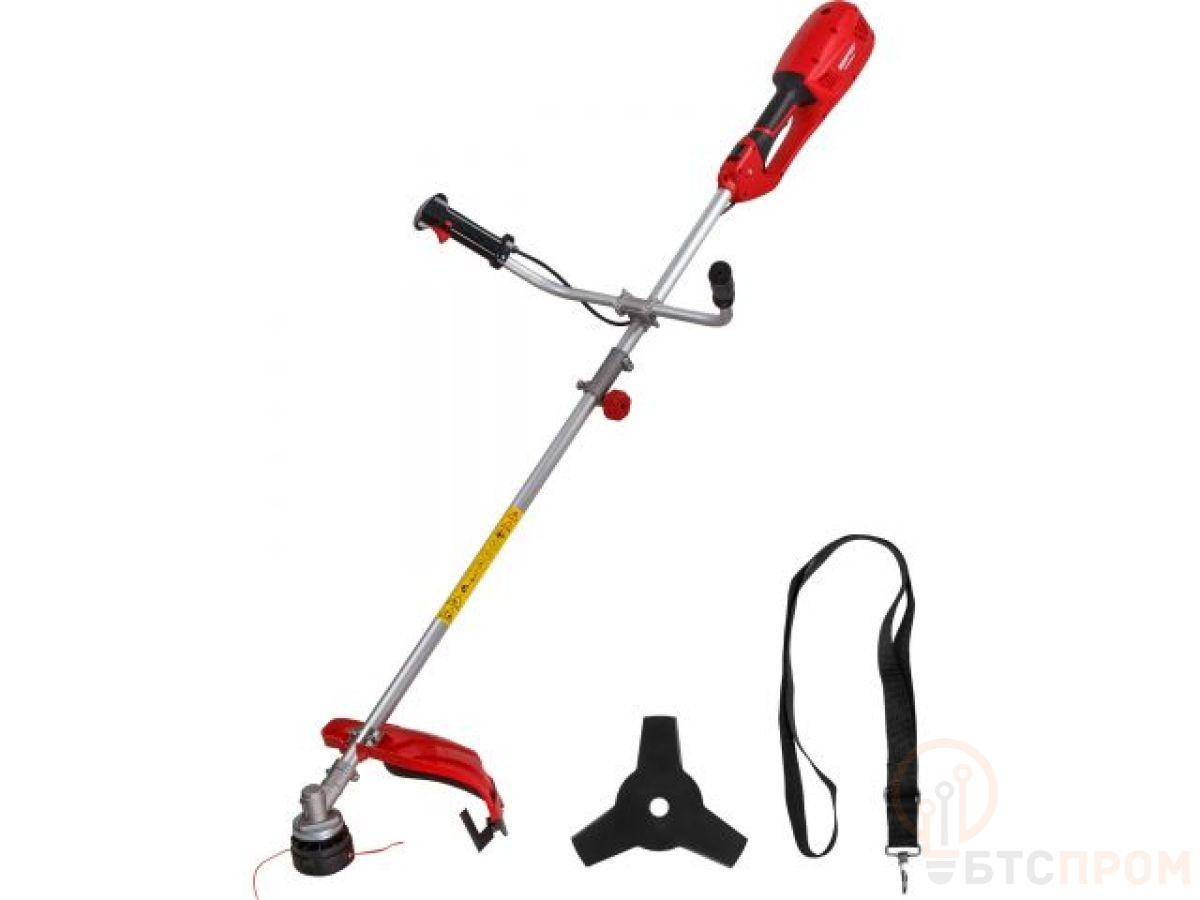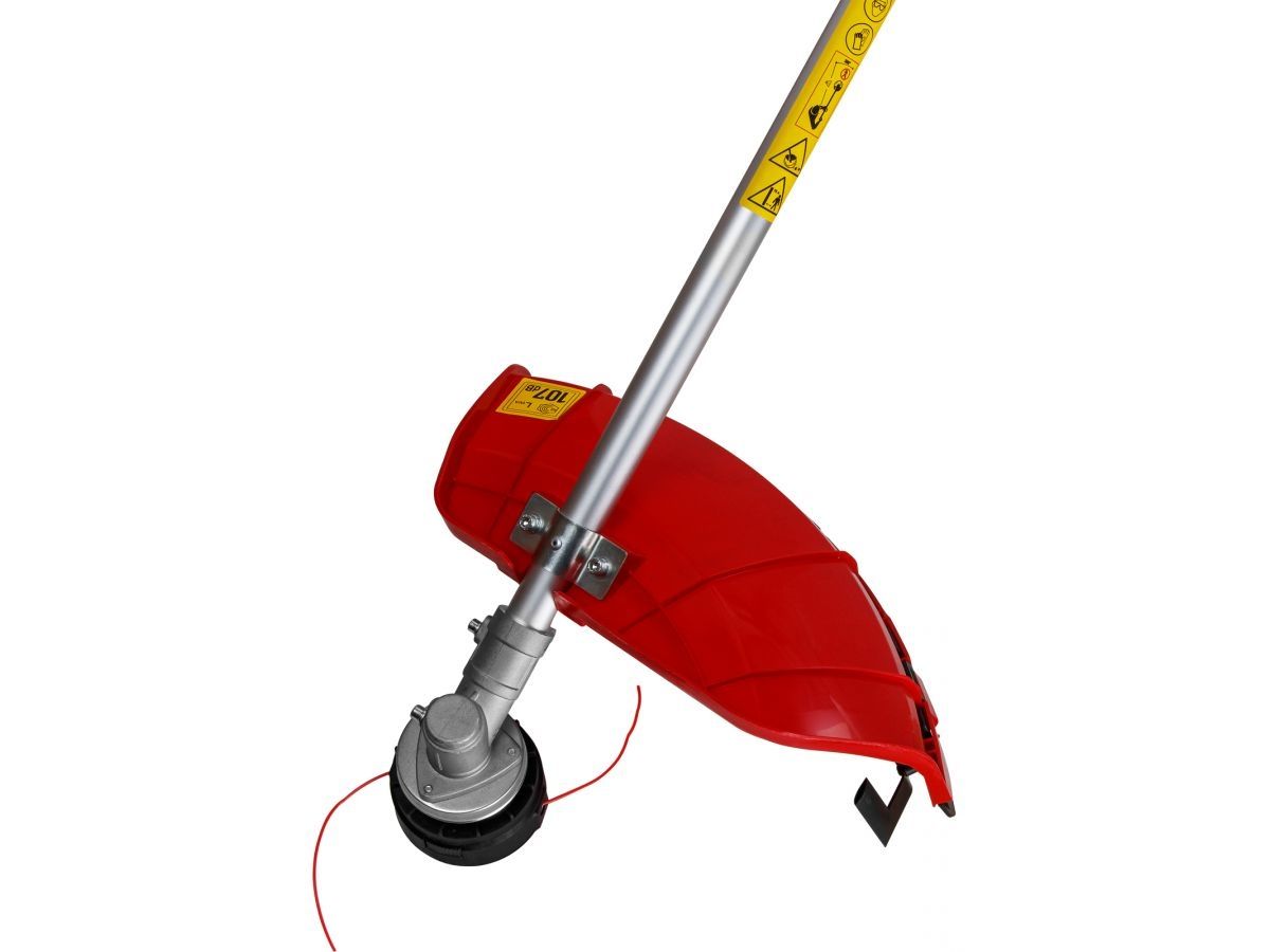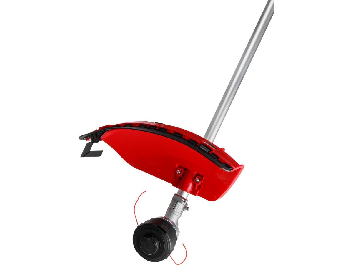 Специальный кожух закрывает режущий элемент для защиты оператора от травм и летящей травы. Предусмотрена возможность эксплуатации инструмента, как с леской, так и с трехлопастным ножом.