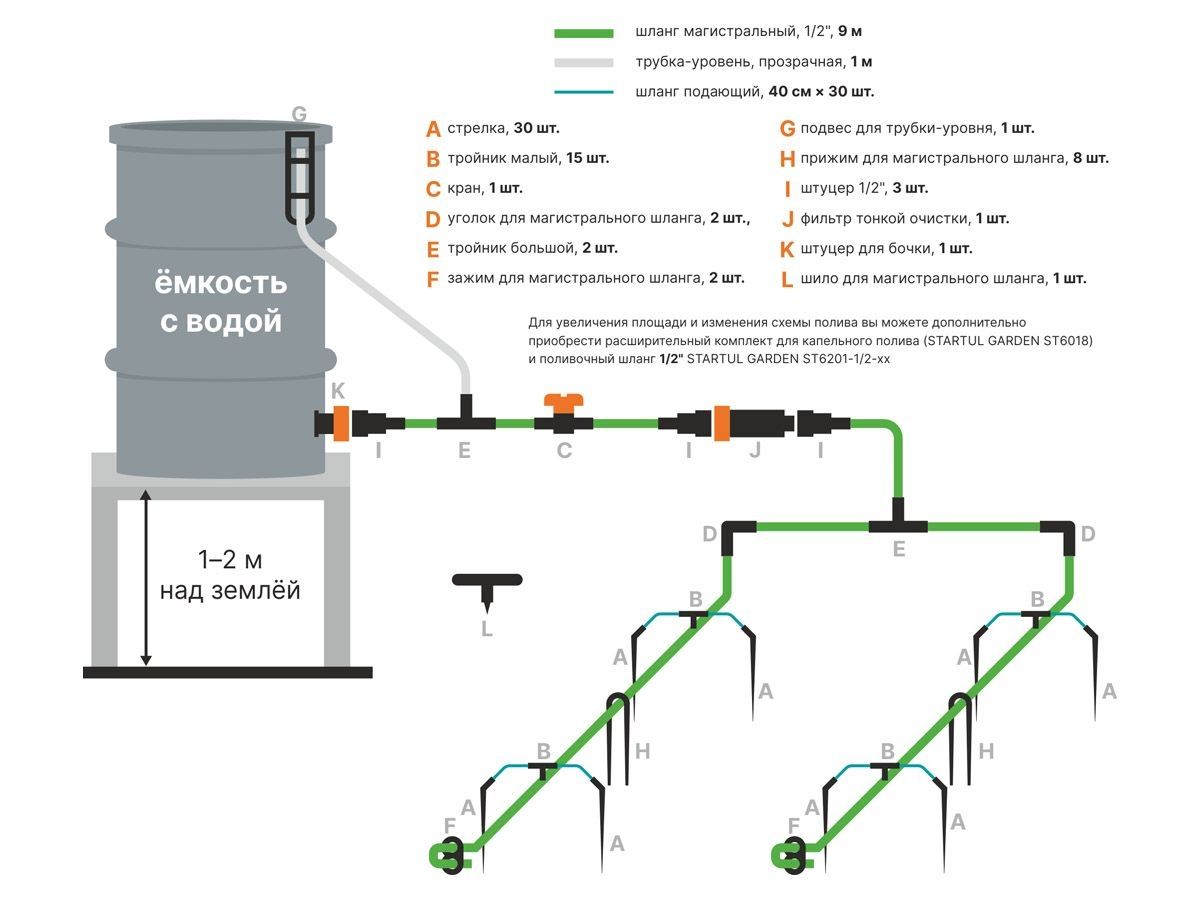 Расширение: для увеличения площади и изменения схемы полива дополнительно приобретается расширительный комплект для капельного полива от ёмкости на 20 растений STARTUL GARDEN (арт.ST6018) и поливочный шланг 1/2" STARTUL GARDEN серии ST6201-1/2-ХХ. Для просверливания отверстия в емкости диаметром 22+1мм рекомендуется для использования коронка биметаллическая d22 мм GEPARD (GP2510-22);