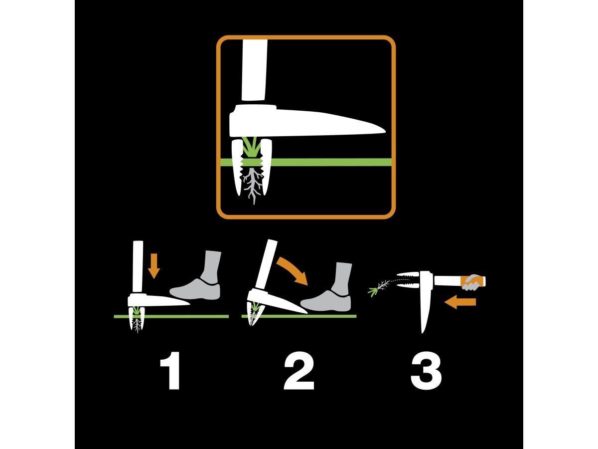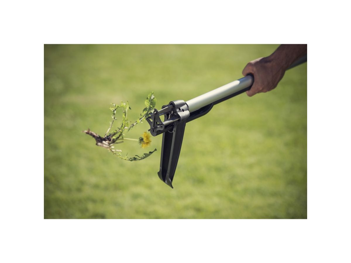 Зубья из нержавеющей стали. Точка опоры рычага на уровне земли. Выталкивающая система позволяет убрать сорняк из граблей после извлечения. Не нужно использовать химикаты. Исключает работу в неэргономичных положениях.