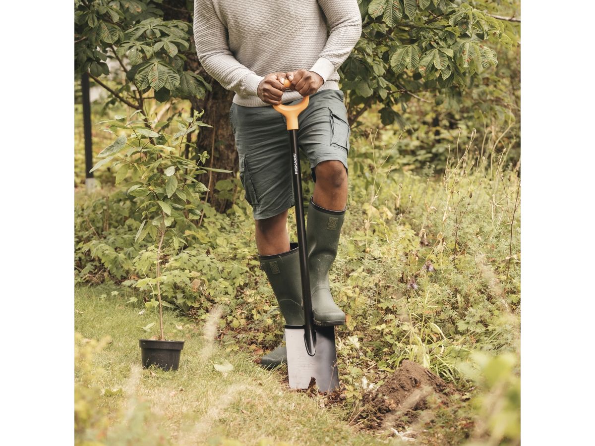 Лопата имеет острую кромку для окантовки, копания и посадки травянистого верхнего слоя почвы. Стальная головка приварена к прочному металлическому валу для дополнительной прочности. D-образная рукоятка подходит для всех размеров рук, как в перчатках, так и без них.