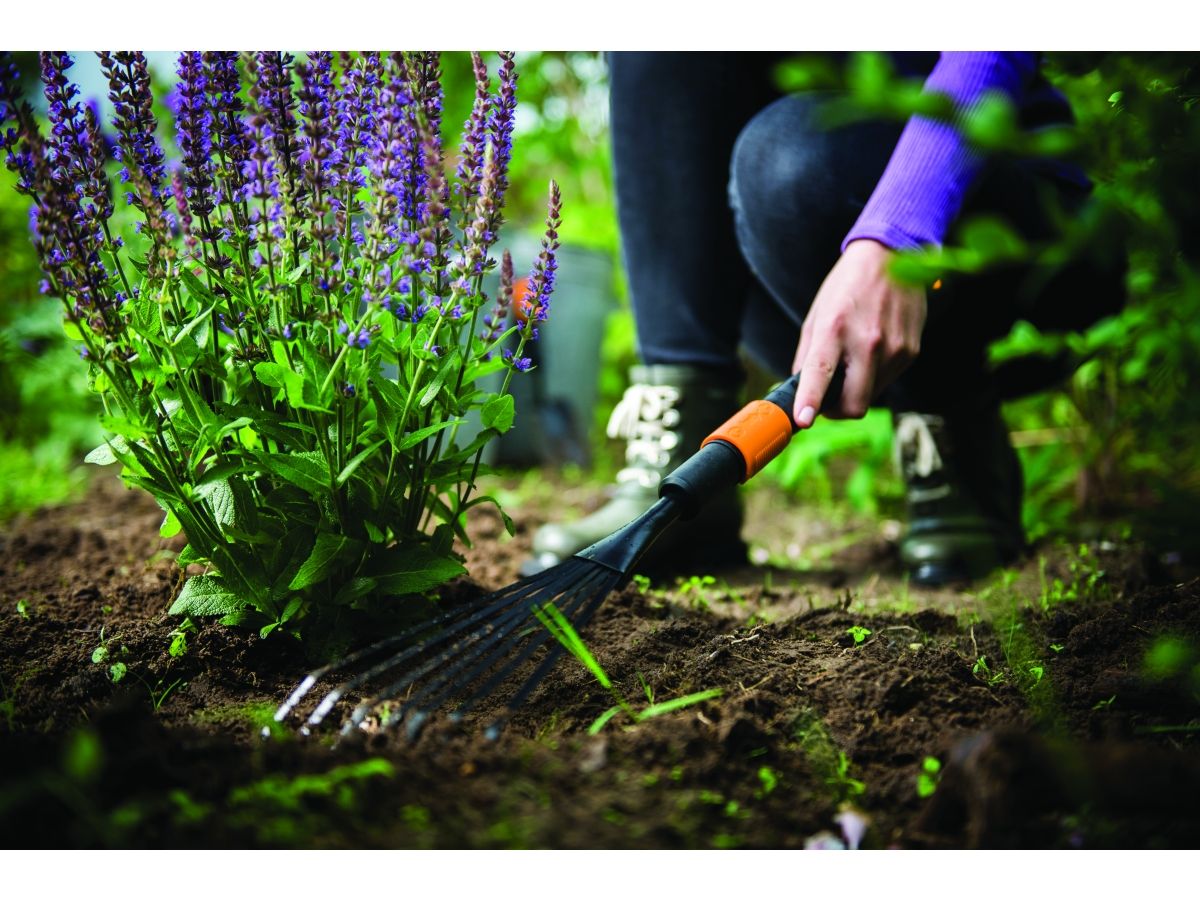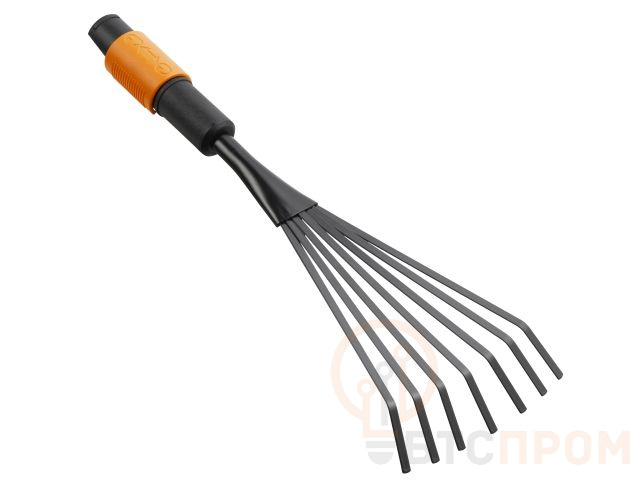 Инструмент не боится больших нагрузок и может быть использован при высокой влажности. Орудие имеет веерообразную форму и изогнутые зубья, которые эффективно загребают мусор. Вместе с насадкой используется любой черенок с подходящим фиксатором