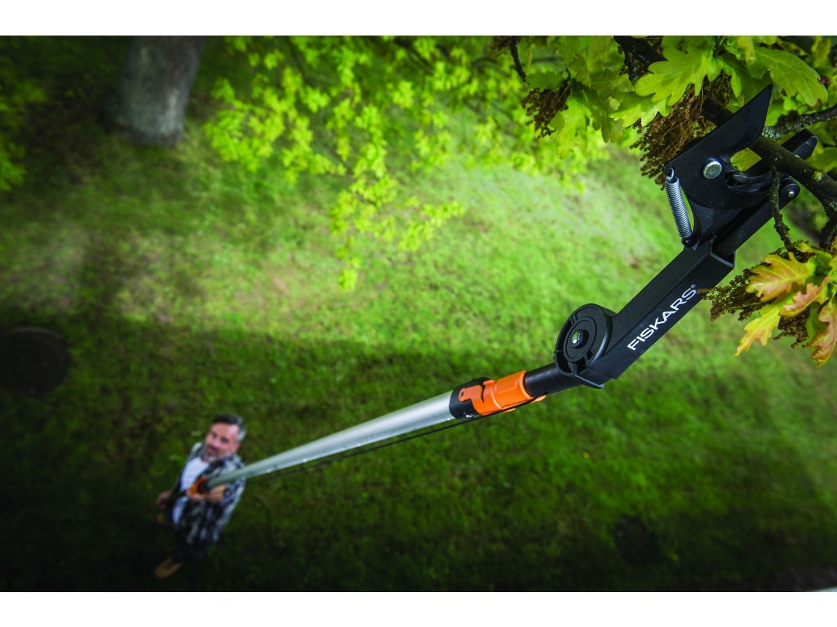 Просто прикрепите веткорез к одному из телескопических черенков Fiskars QuikFit и наслаждайтесь резкой веткой.