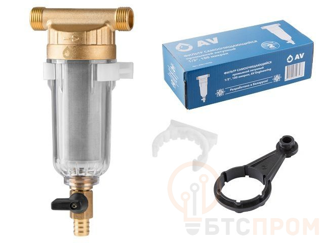 Фильтр самоочищающийся 1/2" нар., 100 микрон, AV Engineering (инд. упак.) (промывной латунный) AVE115703