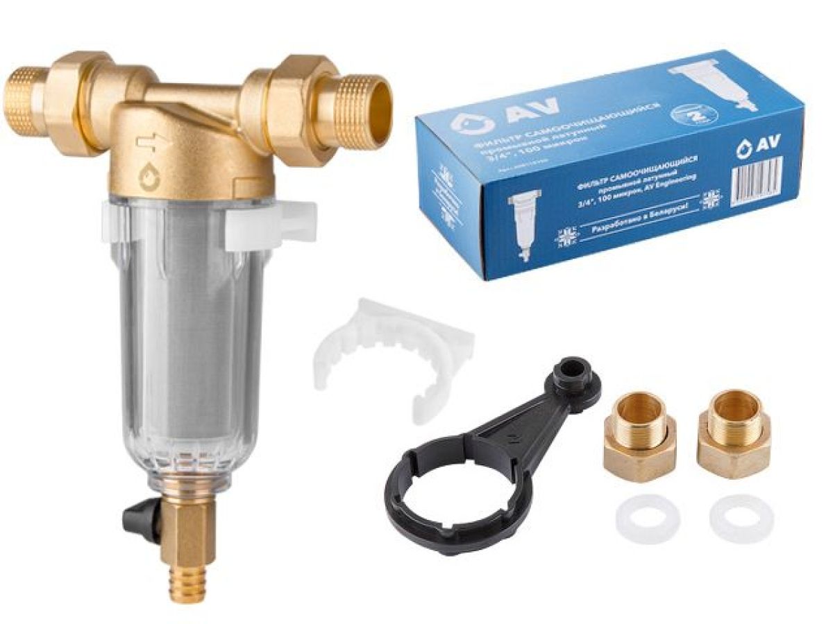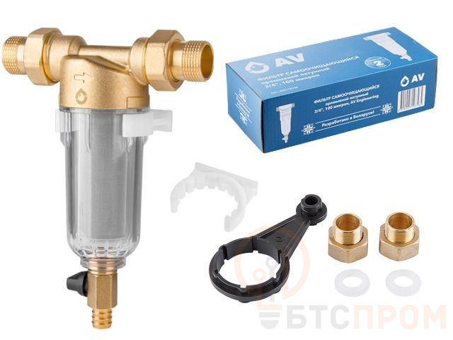 Фильтр самоочищающийся 1" нар. или 3/4"вн., 100 микрон, AV Engineering (инд. упак.) (промывной латунный) AVE115704