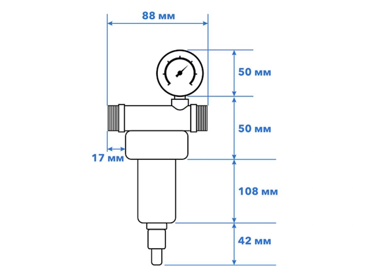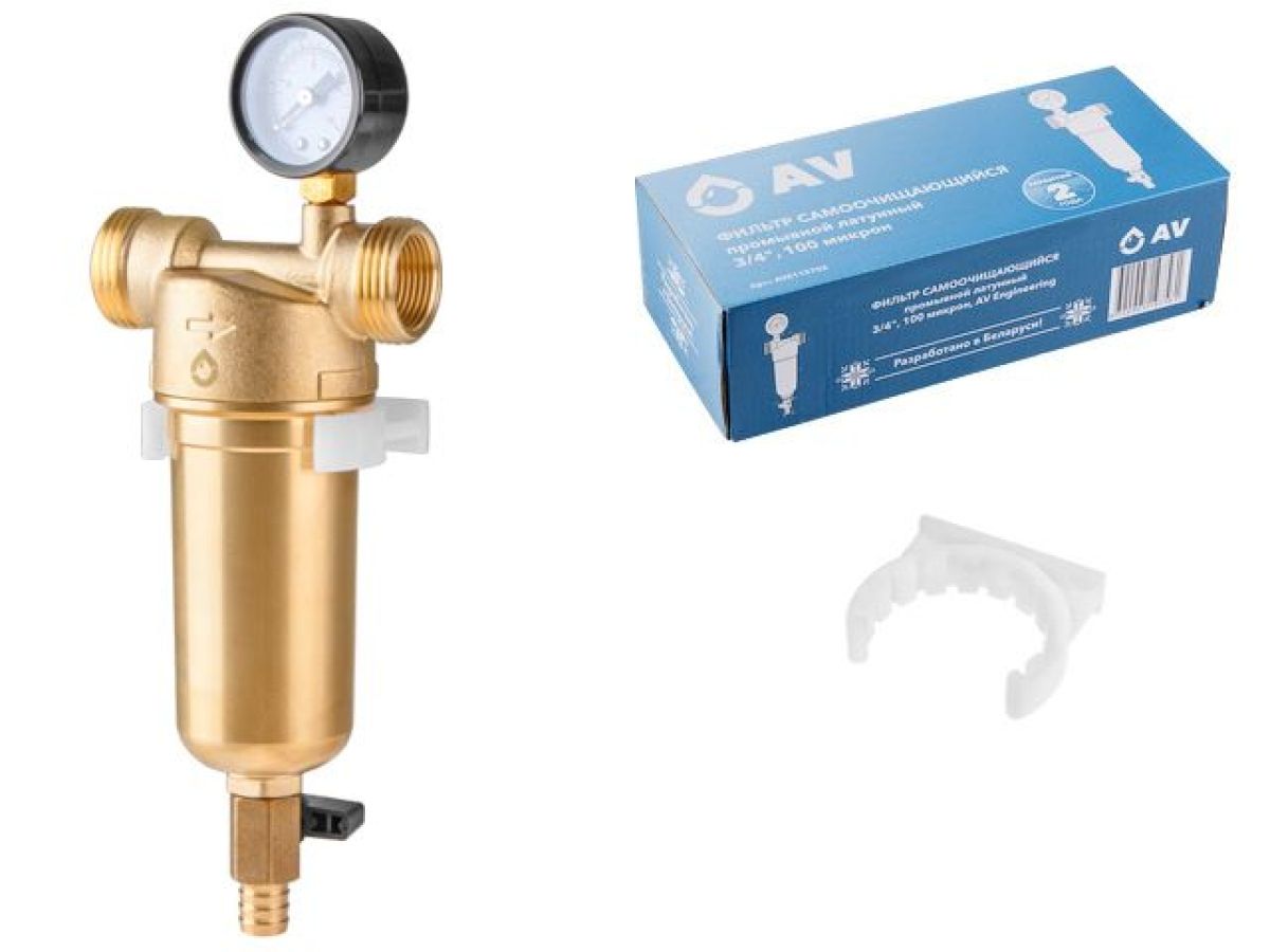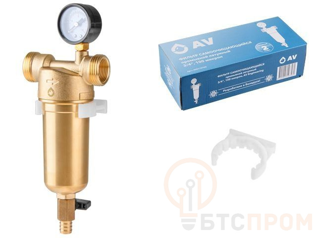 Фильтр самоочищающийся 1" нар. или 3/4"вн., 100 микрон, с манометром, AV Engineering (инд. упак.) (промывной латунный) AVE115702