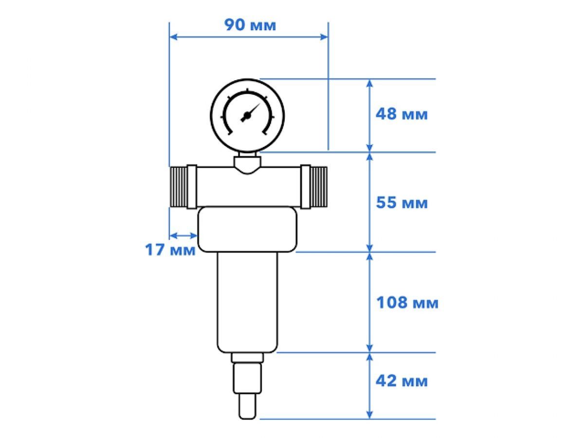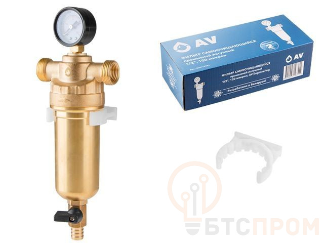Фильтр самоочищающийся 3/4" нар. или 1/2" вн., 100 микрон, с манометром, AV Engineering (инд. упак.) (промывной латунный) AVE115701