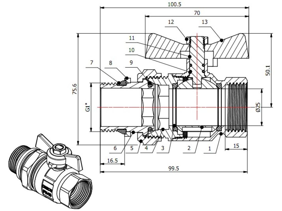 Кран шаровый 1" нар.-вн. бабочка (со сгоном) PN40, AV Engineering (Латунь, макс. 40 бар, макс. 110 °С, с уплотнительным кольцом) AVE095001