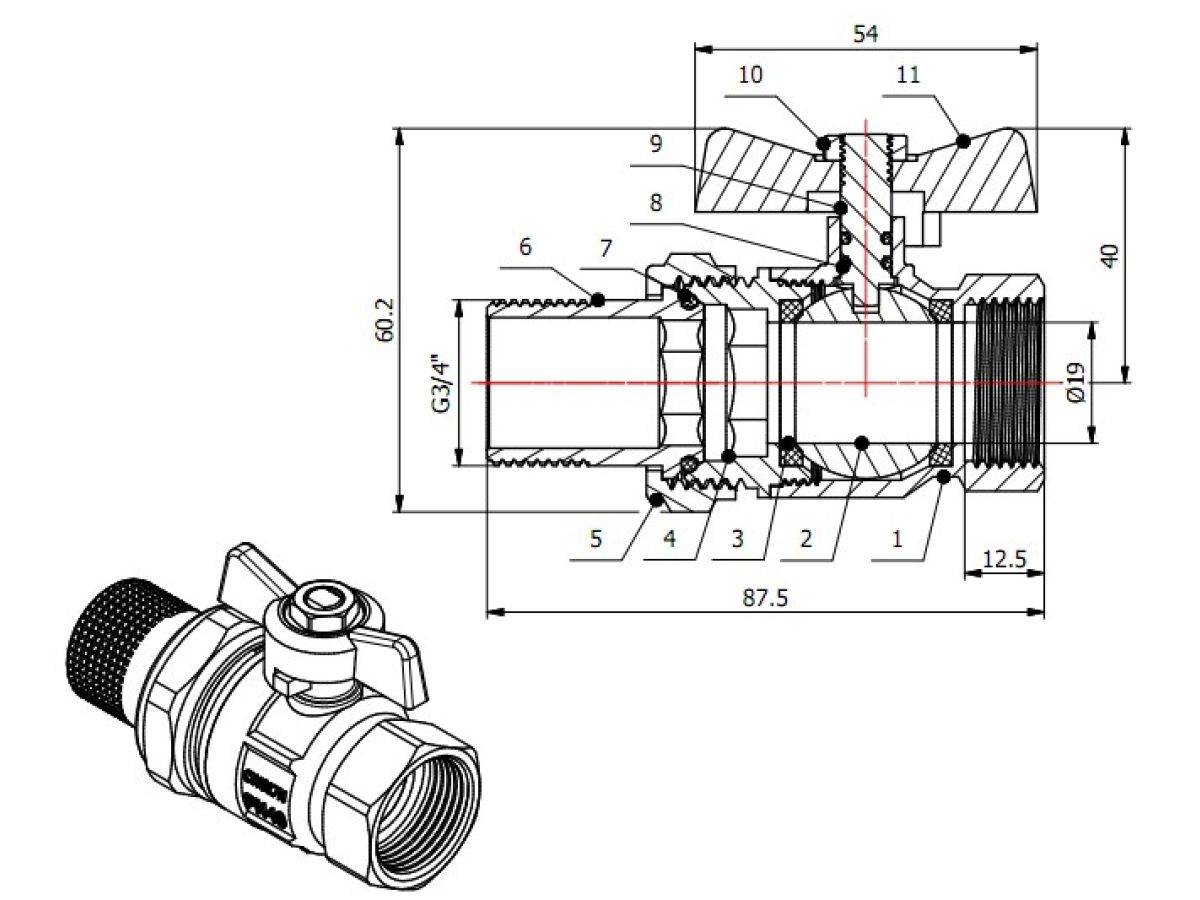 Кран шаровый 3/4" нар.-вн. бабочка (со сгоном) PN40, AV Engineering (Латунь, макс. 40 бар, макс. 110 °С) AVE094034