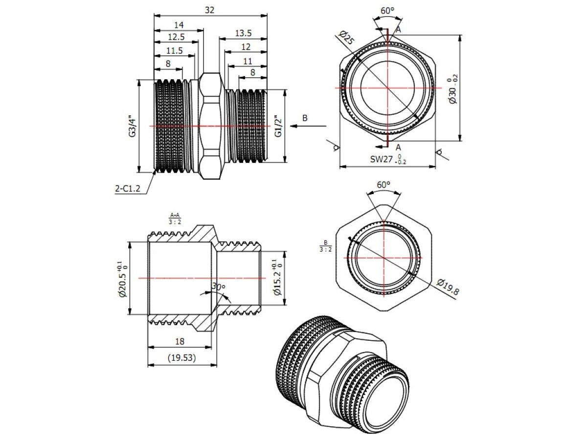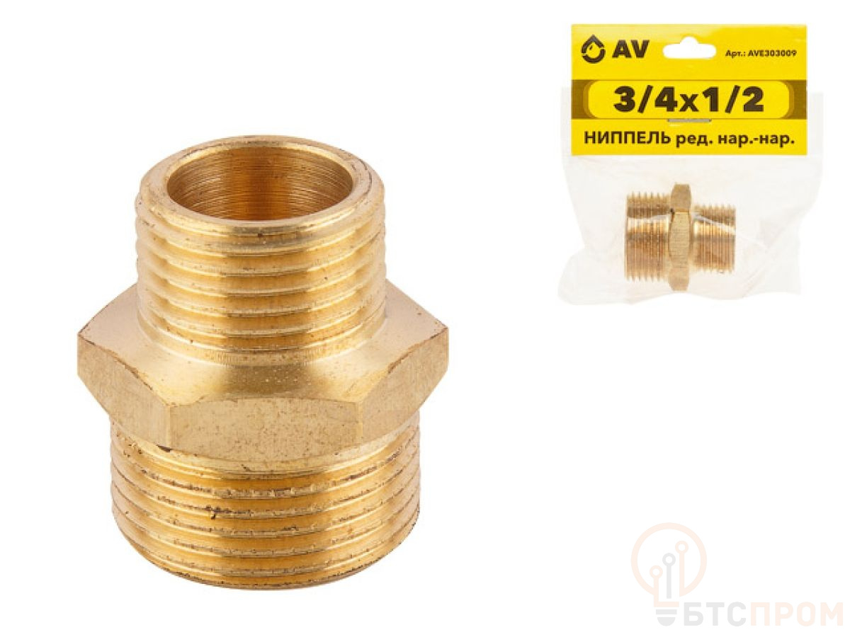 Ниппель ред. 3/4" нар. х 1/2"нар., AV Engineering (инд. упак.) (Латунь, макс. 16 бар, макс. 100 °С) AVE303009