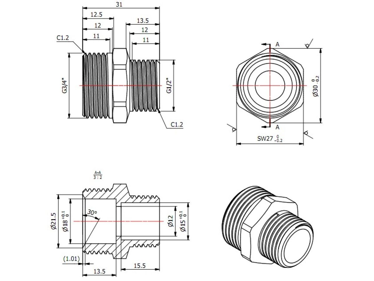 Ниппель ред. под евроконус 3/4" нар. х 1/2" нар., AV Engineering (инд. упак.) (Латунь, макс. 16 бар, макс. 100 °С) AVE309002